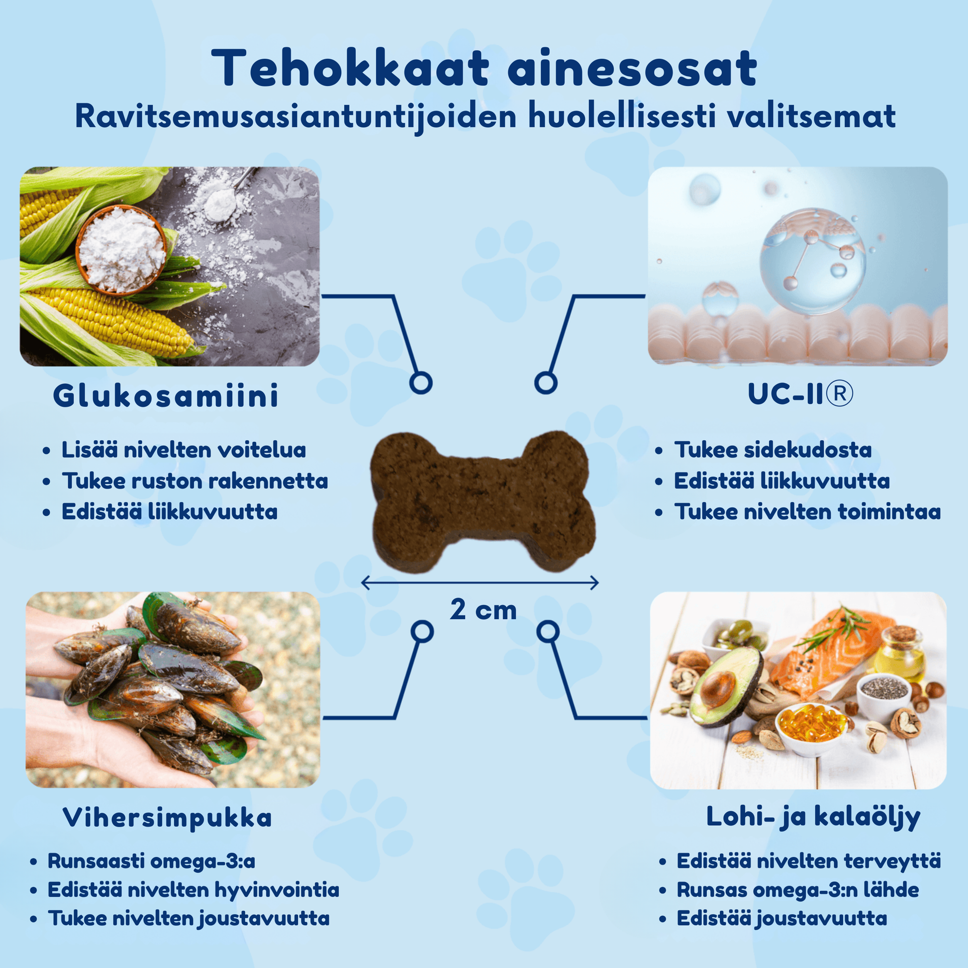 Ainesosat ovat tärkeitä ruston ylläpitämisessä, nivelten joustavuudessa ja päivittäisessä liikkuvuudessa. Monet huomaavat, että koira vaikuttaa aktiivisemmalta, liikkuu helpommin ja innostuu enemmän leikkimisestä ja liikkumisesta arjessa – iästä riippumatta.