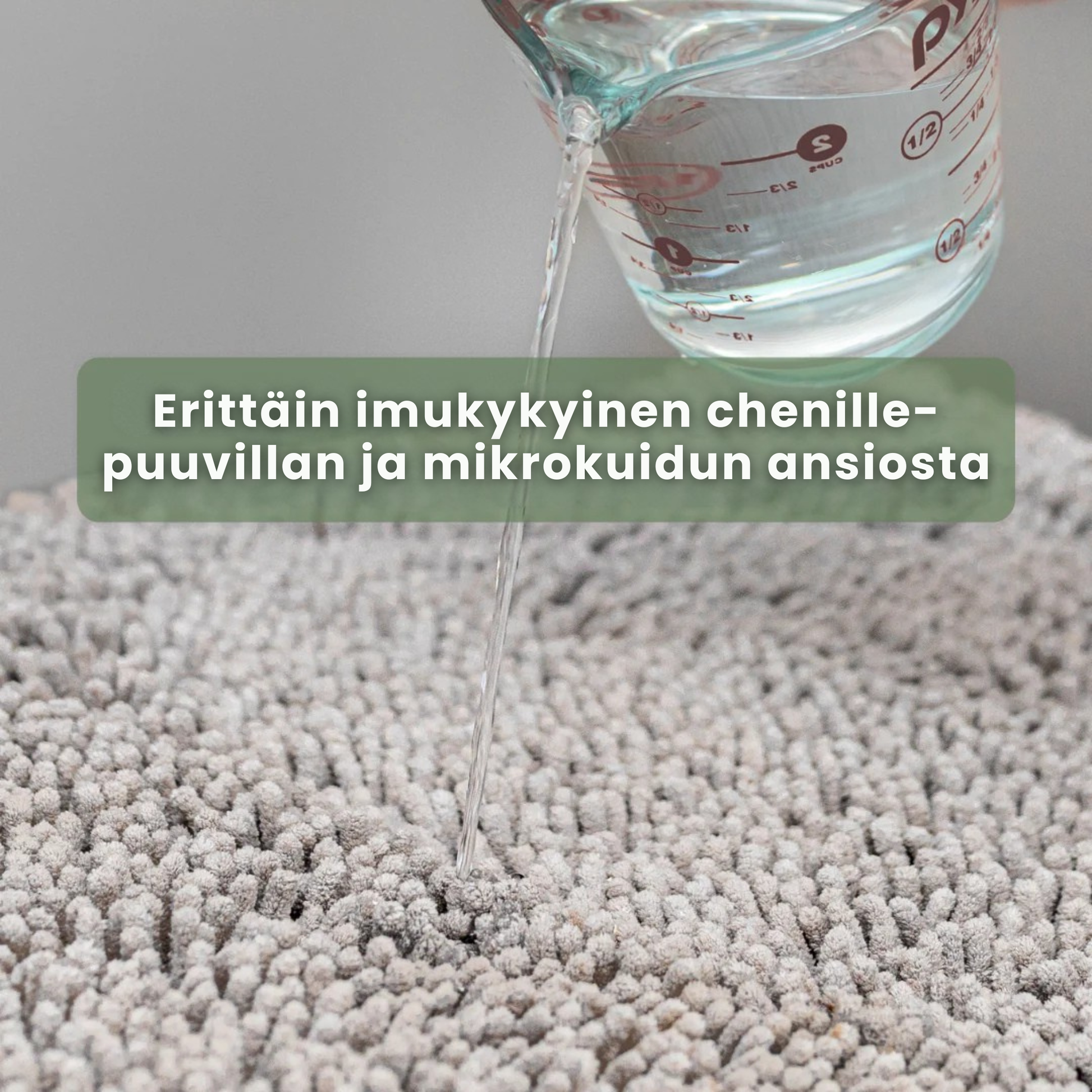Korkeiden kuitujen ansiosta matto irrottaa sekä karkean että hienon lian, joka on piilossa tassujen välissä, ja imukykyinen sekä pehmeä chenille-materiaali imee kosteuden tassuista.