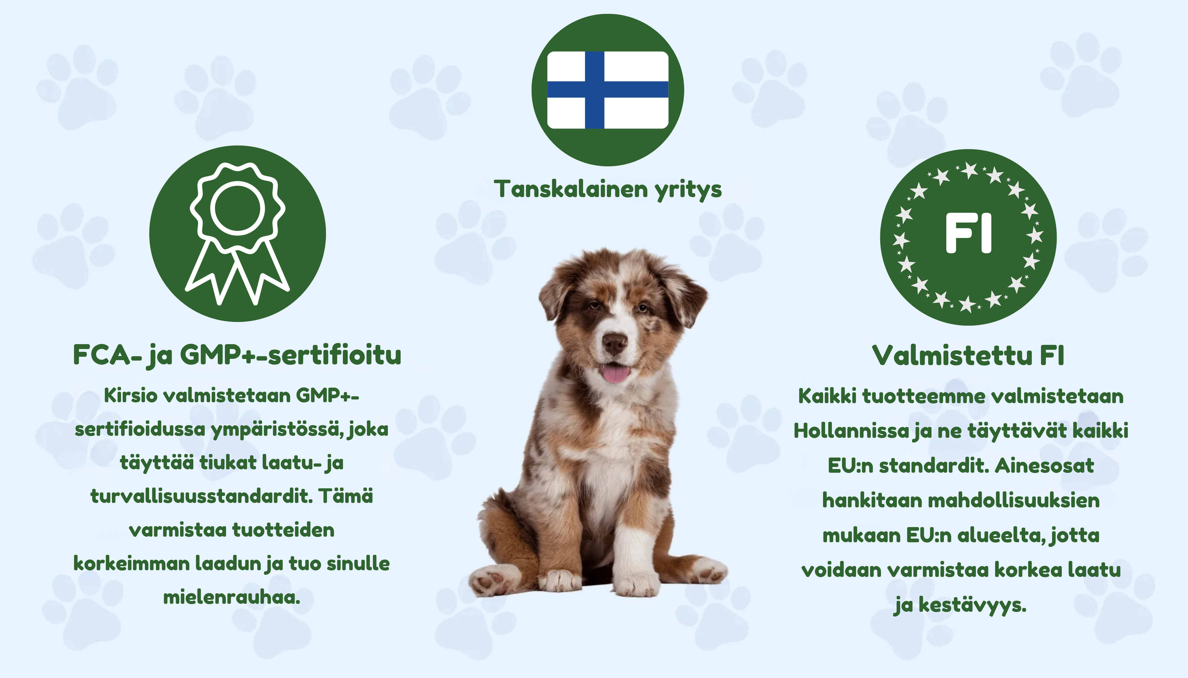 Monet koirat ovat allergisia tavallisille proteiinilähteille, kuten naudanlihalle ja kanalle. Siksi käytämme kalaa – hellävaraista ja maukasta proteiinilähdettä, joka on koirasi vatsalle helposti sulava.