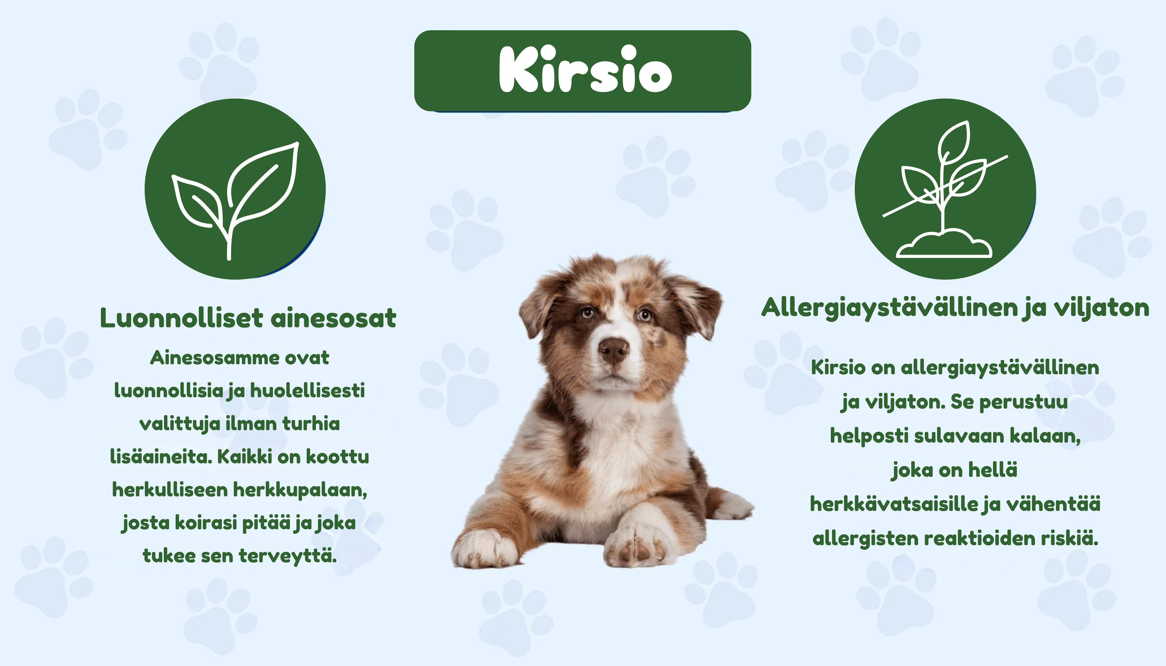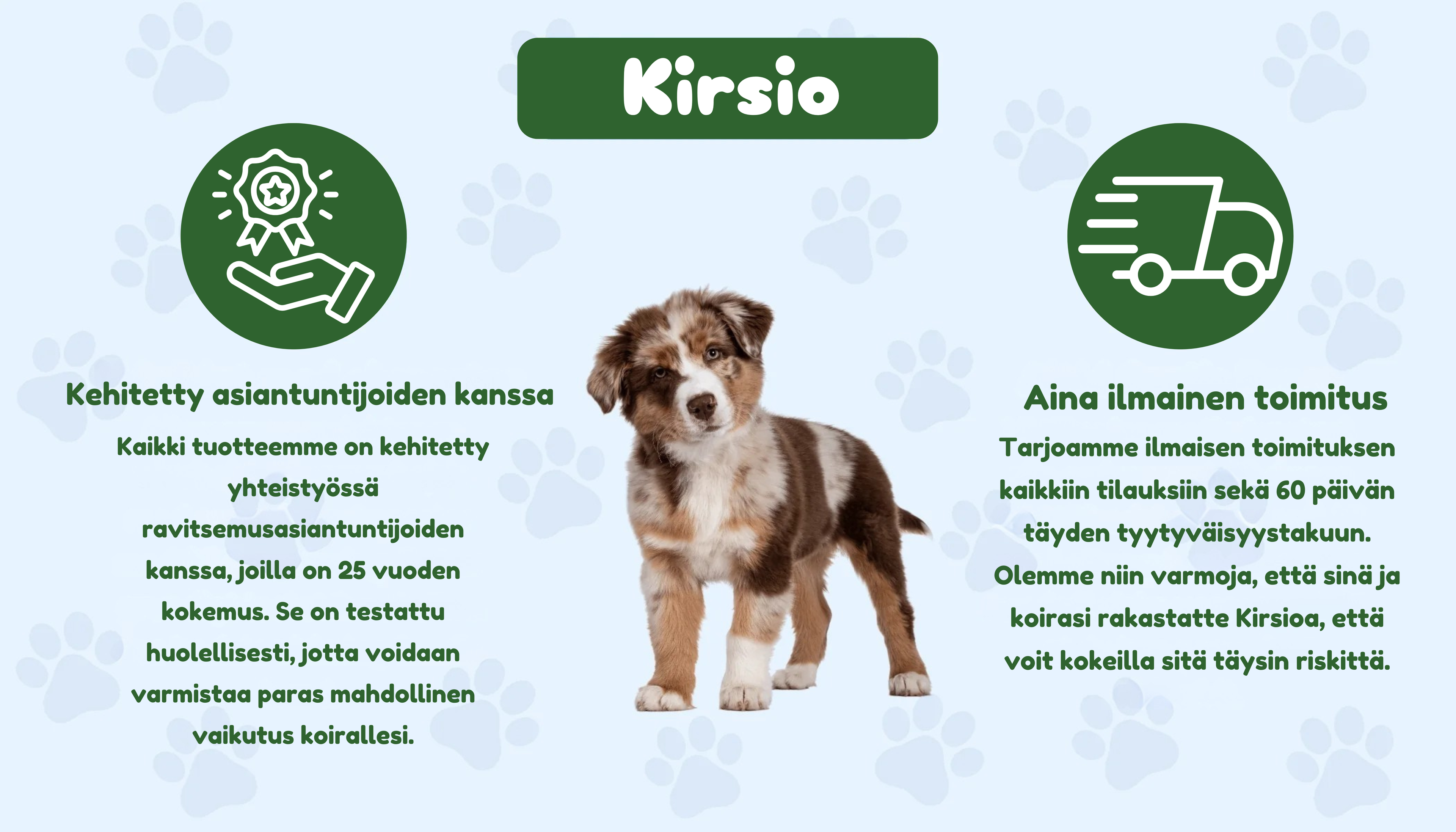 Tulokset näkyvät yleensä 3–5 viikon päivittäisen käytön jälkeen. Tämä voi kuitenkin vaihdella koirasta toiseen. Jotkut huomaavat vaikutuksen jo muutamassa päivässä, kun taas toisilla se voi kestää jopa 8 viikkoa. Tarjoamme tyytyväisyystakuun, joten koirasi voi kokeilla Kirsioa täysin riskittä.