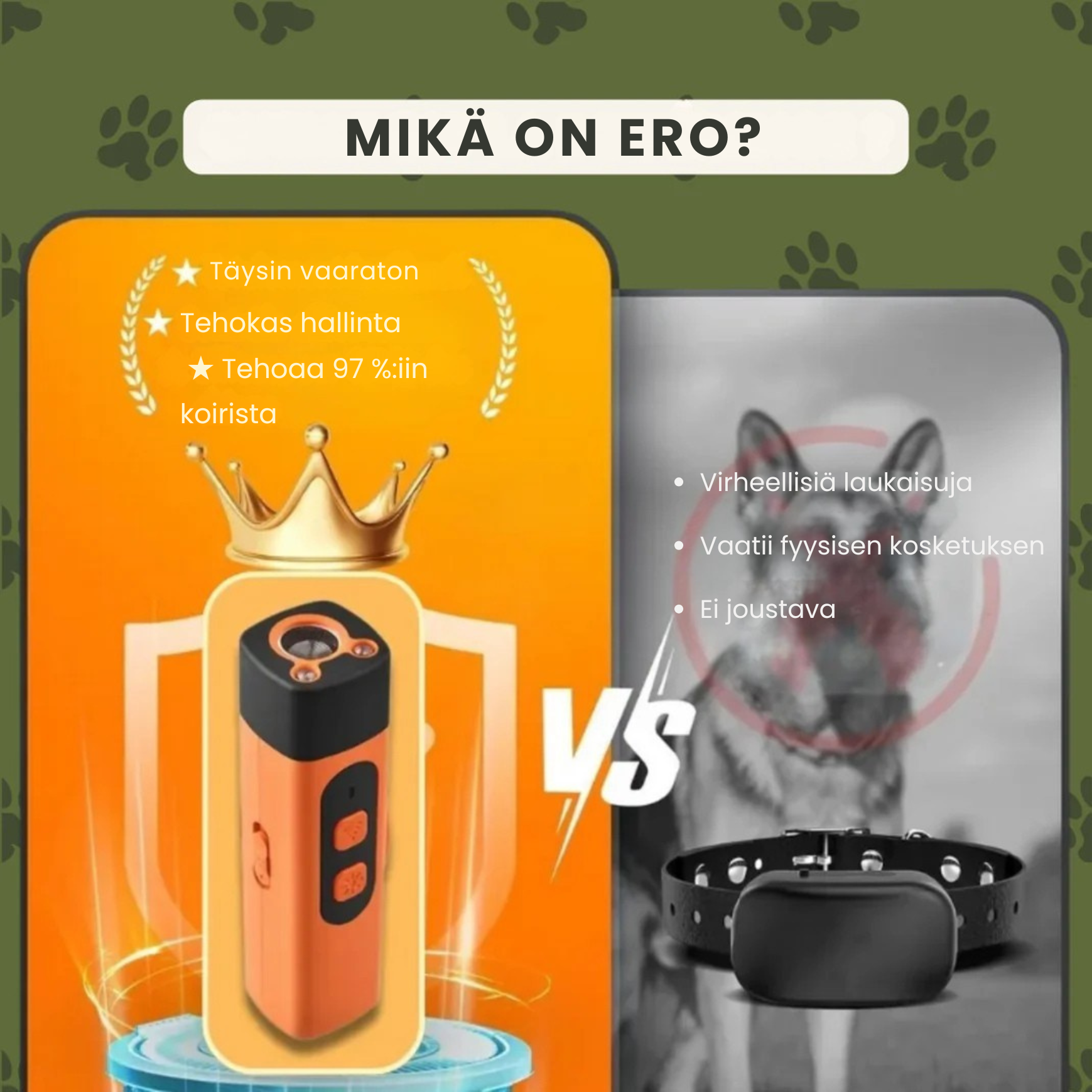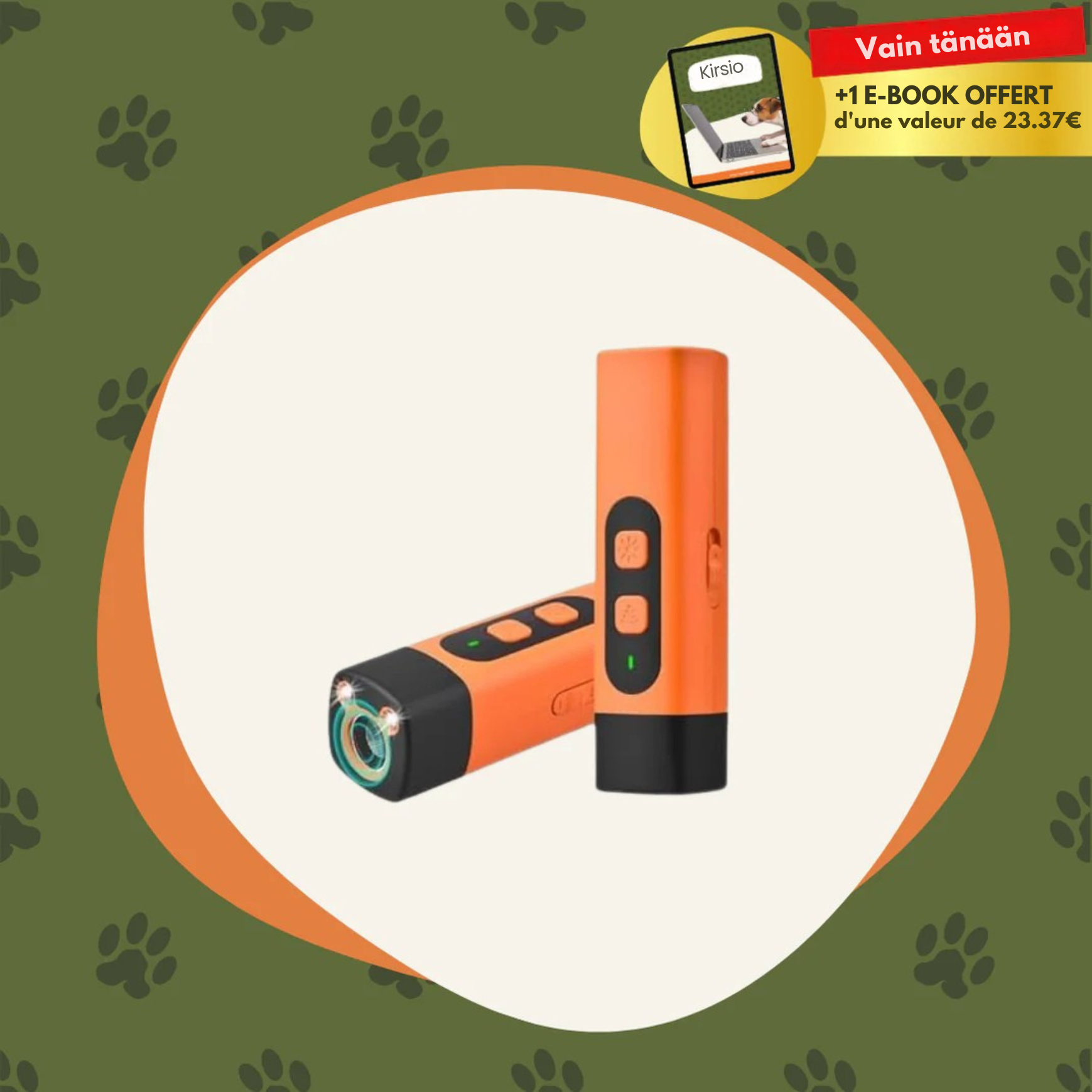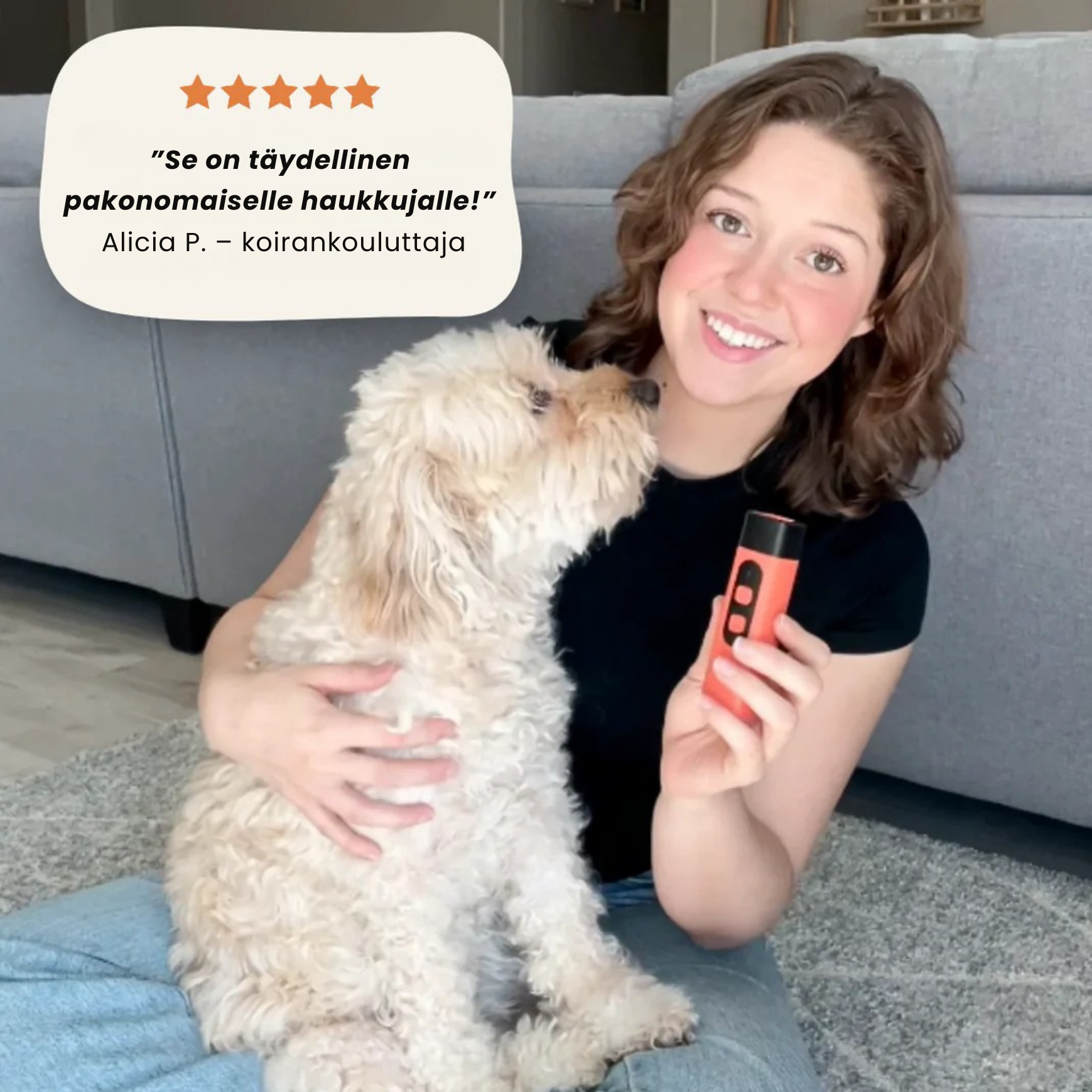 Kyllä, Stop-Kirsio™ on täysin turvallinen ja eläinystävällinen. Se käyttää vaarattomia ultraääniaaltoja, jotka keskeyttävät haukkumisen tehokkaasti ilman kipua tai stressiä. Aggressiivisia menetelmiä ei käytetä – ei sähköpantoja eikä suihkeita – joten kyseessä on lempeä ja myötätuntoinen koulutusväline.
